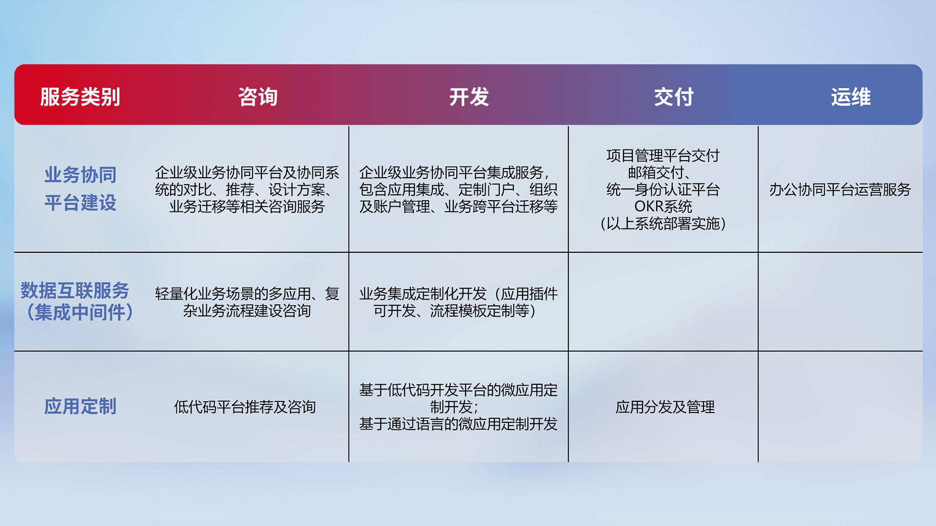 针对钉钉、、企微、、、、IDaas等平台级产品提供产品的规划、、、、方案、、交付、、、定制化开发等服务,,,,实现如统一协同办公、、智能客户服务、、、混合会议管理、、智能数据查询、、等业务场景,,,,实现数字化转型。。