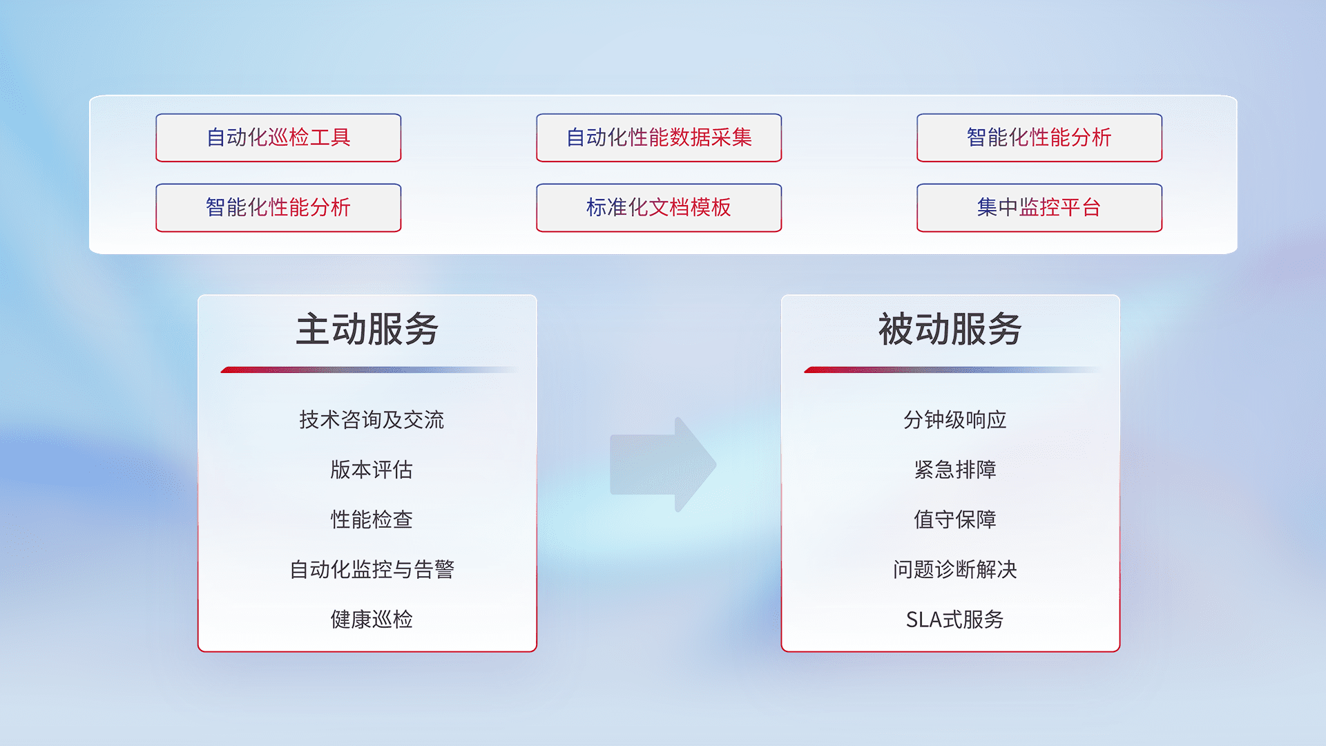 智能化工具和标准化文档,,,,保障服务质量,,,,提供主动服务(包含技术咨询、、版本评估、、、性能检查、、、自动化监控与告警、、健康巡检)和被动服务包含(分钟级响应、、、、紧急排障、、值守保障、、、、问题诊断解决、、SLA服务)。。